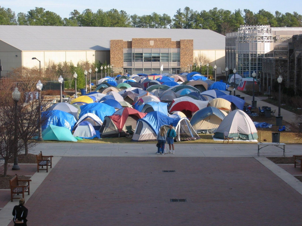 When it comes to college basketball, you have to ask fans a question. What would you do to get a ticket to see a game? Pre-purchase in advance? Wait in line for a few hours? Camp outside for a month or two. Yes, you read that right. Students at Duke University camp outside Cameron Indoor Arena in “Krzyzewskiville” (named after the legendary Blue Devils head coach, Mike Krzyzewski) in the middle of the winter anywhere from 4 weeks to about 2 months just to get a seat at highly anticipated Duke matchups. Especially when the University of North Carolina Tar Heels come to town. What started as a way for a few students to get a guaranteed head start in line has now become a staple at Duke. Overseen by the athletic department, it has become a tradition for students. There are even strict rules that all tents must follow to remain eligible to earn seats to watch one of the greatest rivalries the sport has ever seen. There is a maximum of 12 occupants per tent. At all points during the day, there must be 2 people occupying the tent; at night, there must be 10. As if sleeping outside for weeks wasn’t bad enough, only 100 tents can camp out. That means if more than 100 registers (which is extremely common), they will hold a trivia contest. The questions are all based on the current Duke’s men’s basketball season. The highest scores can get to set up shop, the rest are waitlisted. Multiple tent checks happen at night to make sure each has the right number of students. It takes a special (and slightly crazy) fan to even attempt something like this.